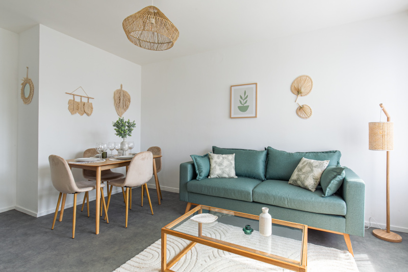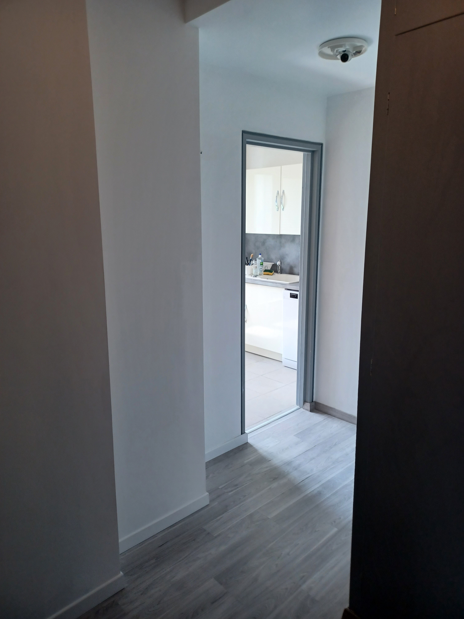 L'appartement de 59m2 est composé d'une entrée, une pièce de vie avec un petit exterieur, une cuisine aménagée et équipée, 3 chambres, un wc, une salle d'eau