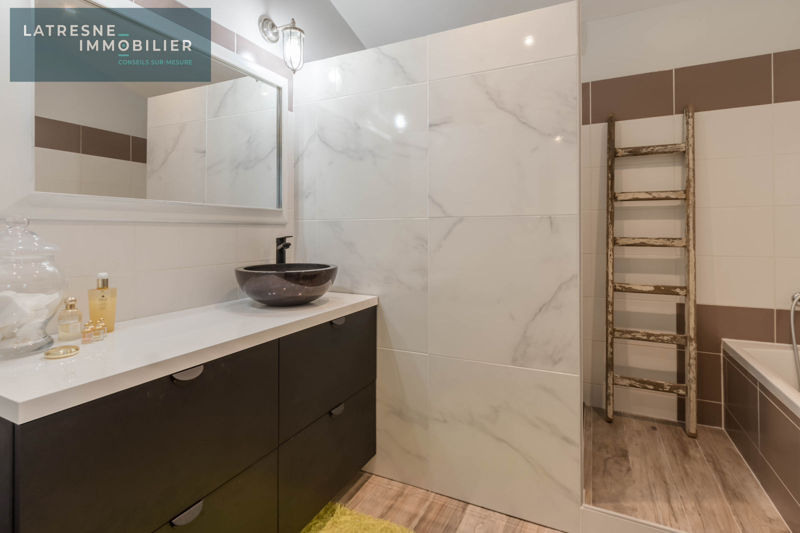 Elle se compose au rez de chaussée d'une très belle pièce de vie lumineuse avec sa grande baie à galandage qui donne sur une terasse en bois, d'une cuisine ouverte toute équipée, d'une grande buanderie ainsi que d'une suite parentale avec douche et baignoire.
